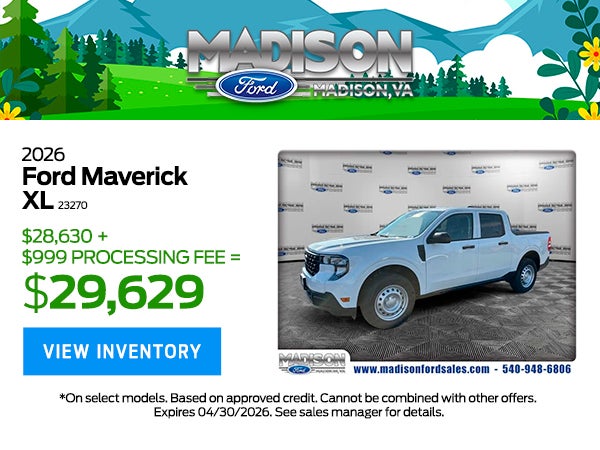 All vehicles are subject to prior sale and financing is subject to approved credit. Madison Ford is not liable for errors or omissions. Quoted prices available on in-stock units only. Tax and Tags are not included in the E-Price, Price does not include $999 Processing Fee. All customers will qualify for all manufacturer rebates and incentives included in the E- Price, some require financing through the manufacturer. Some manufacturer rebates are not compatible with special manufacturer finance offers. Manufacturer rebates and incentives are valid during the time period set by the manufacturer and are subject to change without notice. Additional manufacturer rebates such as but not limited to college graduates, Military and additional incentives may apply to those who qualify and may lower the sales price. Rebates and Incentives may vary based on your zip code. By Submitting your information, you are giving dealer permission to Call/Text and Email you. See dealer for details.